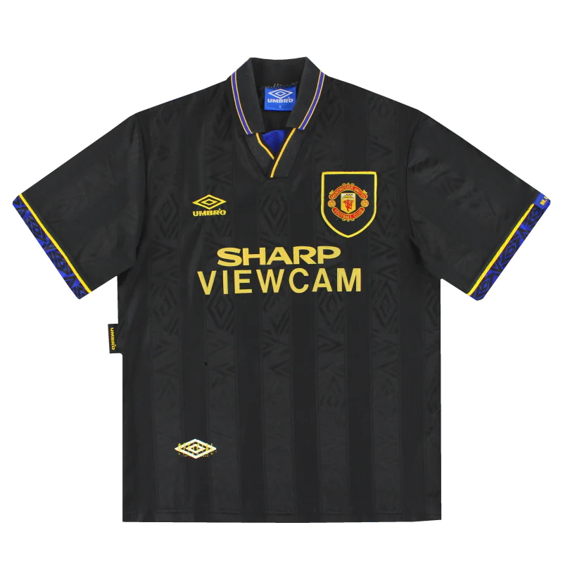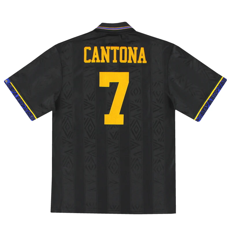 Very popular black and gold away shirt, which became famous around the world for Eric Cantona’s Kung Fu Kick antics at Selhurst Park against Crystal Palace, in which he subsequently received a one year ban. At a press conference later, Cantona made the famous When the seagulls follow the trawler, its because they think sardines will be thrown into the sea Quote