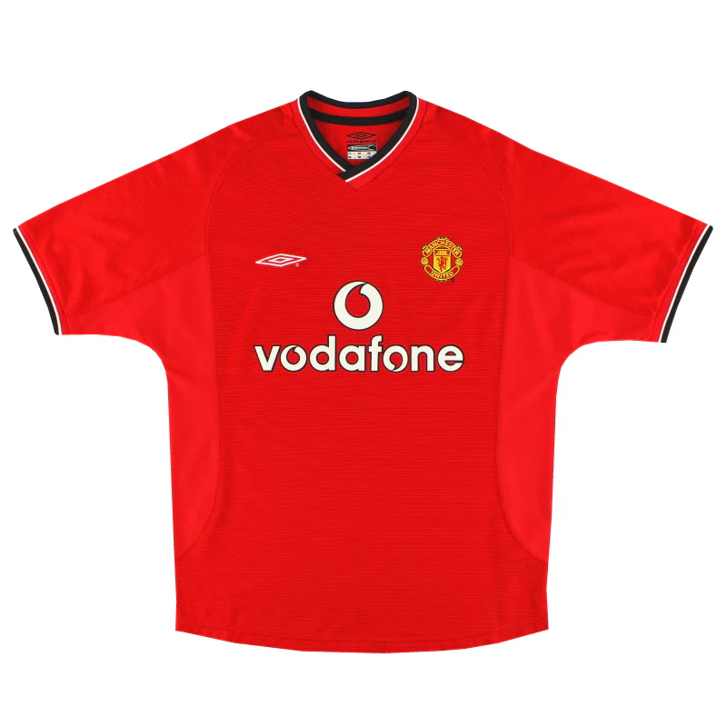 The end of an era as Sharp’s shirt sponsorship deal expired and mobile phone giant Vodafone took its place. Worn in the 6-1 win over Arsenal in the Premier League as well as in a great comeback against Spurs where United were 3-0 down at half time, only to eventually win 5-3. Manchester United finished as champions in their first season wearing the shirt before finishing 3rd the following year – the first time they finished outside the top two in the Premier League era. The Red Devils made it to the 2001-02 Champions League semi finals, being knocked out on away goals against Bayer Leverkusen.