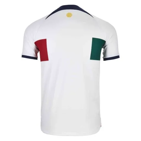 Classically A Seleo, this away stadium shirt from Nike is the perfect addition to Portuguese fans wardrobe. A replica of the shirt worn by the players during the 2022 FIFA World Cup, it sees a white base accented by navy blue cuffs on the neck and sleeves, while the centre sees the traditional green and red of the country adorn it. Nikes patented Dri-FIT technology adds to the cool feel, quickly removing sweat away from the body before, during and after matches.