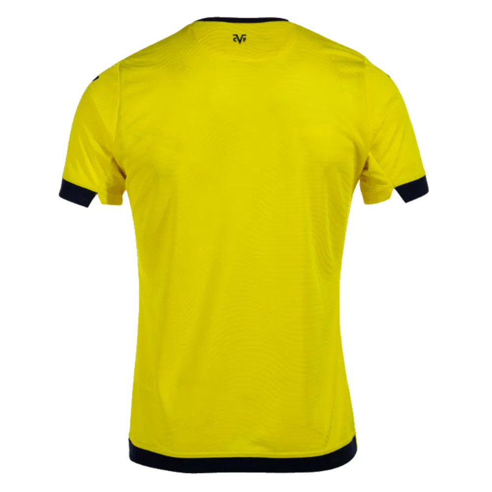 The 2023-2024 Villarreal Home Shirt features the iconic yellow colour of Villarreal while incorporating renewed aspects and an elegant style with navy applications. The fabric of the shirt features a Jacquard finish with wave patterns that enhance breathability and also includes navy blue details, including a small emblem on the back. The design features a regular pattern with a ribbed round neckline and a peak detail in the mesh. The sleeves have a double mesh and ribbed finish, and the bottom has a half-ribbed channel for improved fit, comfort, and freedom of movement.