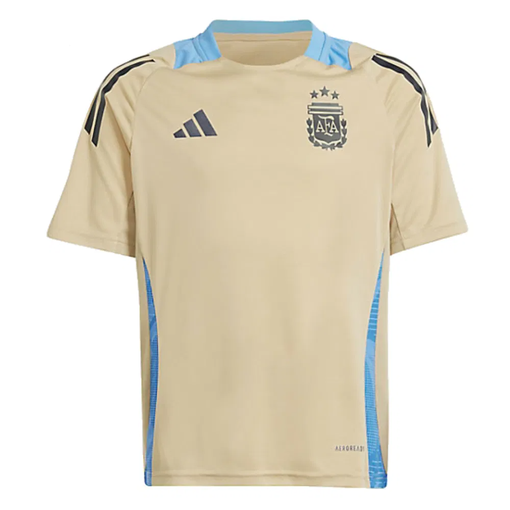 Official Your Name football shirt. This is the NEW Argentina Training Jersey (Hazy Beige) – Kids for the 2024-2025 season which is manufactured by Adidas and is available in all Childrens sizes.
