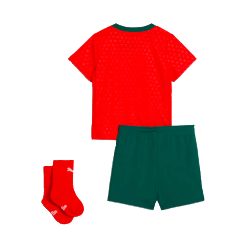 Tradition fuels ambition in the first-ever Portugal Home Kit by PUMA. With signature Portuguese colors and repeated graphics of the Quinas emblem from the national coat of arms, its a kit that pays tribute to the brilliant past, while setting the stage for the next generation to shine even brighter. Designed for the youngest fans, this babykit pairs the same match-worn look with a casual silhouette, details, and materials, ideal for both game day and everyday wear.