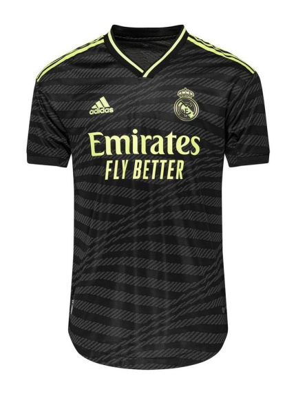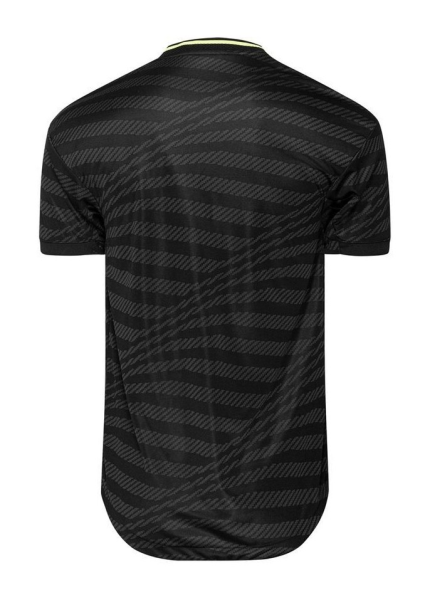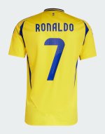 The Adidas Al-Nassr 24-25 shirt has the team’s classic colors. It is mainly yellow combined with blue logos and panels. Officially, the colors are “Impact Yellow/Team Royal Blue”. The shirt has a V-shaped collar with blue/yellow striping in the rear part.