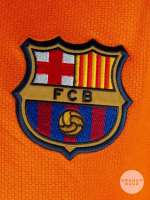 Deco’s orange and blue No.20 Barcelona Champions League short-sleeved shirt, 2007-08, Nike, L, with v-neck collar and embroidered cloth badge inscribed FCB, the reverse lettered DECO, the right sleeve with Champions League flash.