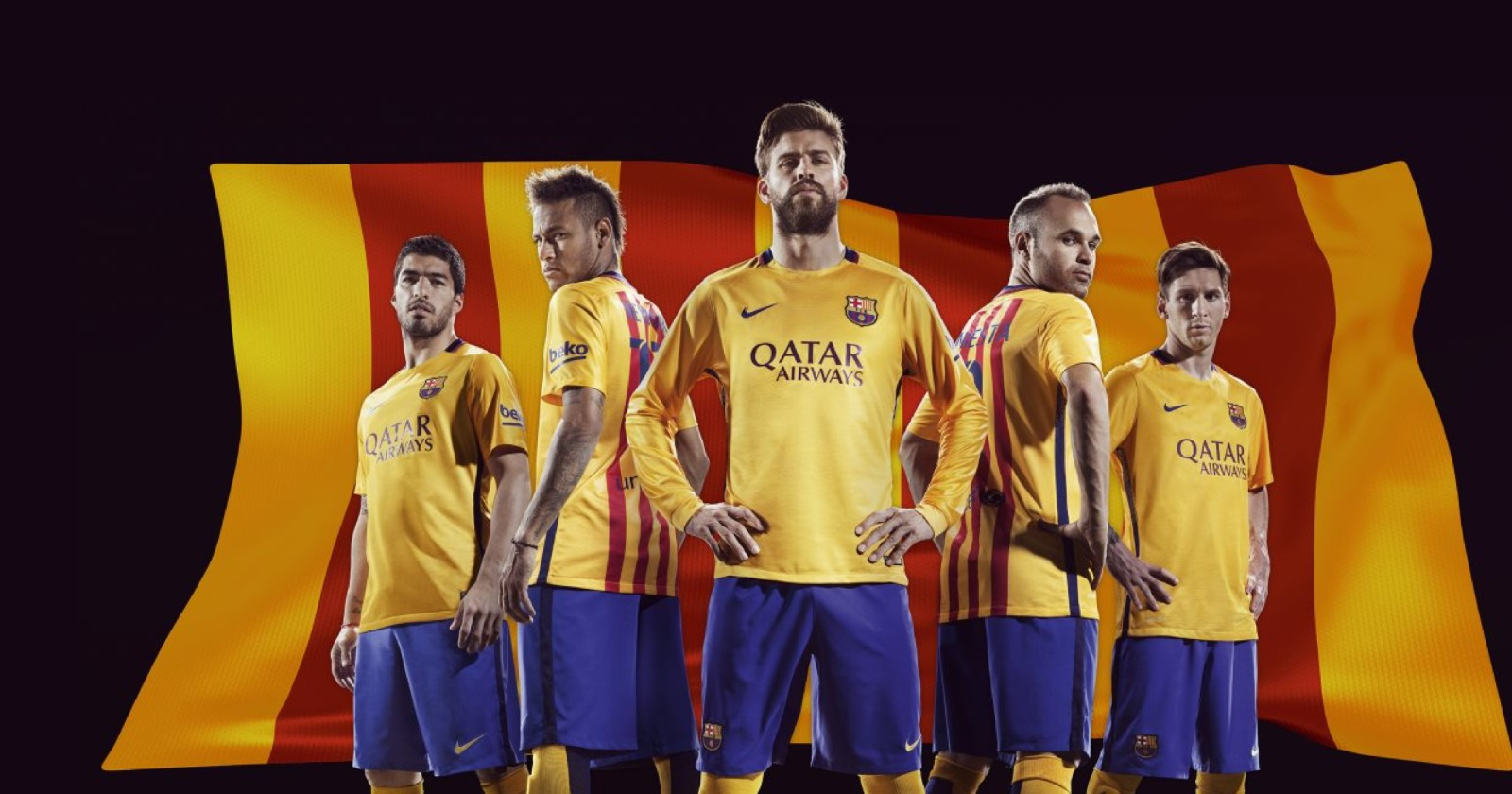 The Barcelona 15-16 away shirt has an orange yellow / red design, inspired by the Catalan flag, the ‘Senyera’. The backside of the Barcelona 2015-2016 away jersey holds orange and red vertical stripes, while the sleeves and the front are solid orange.