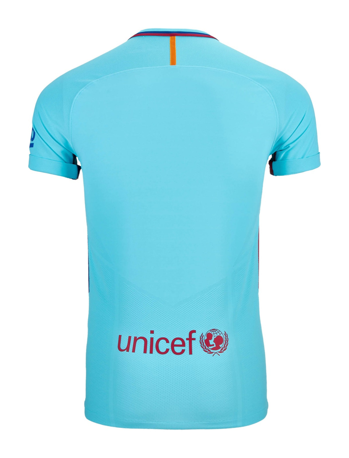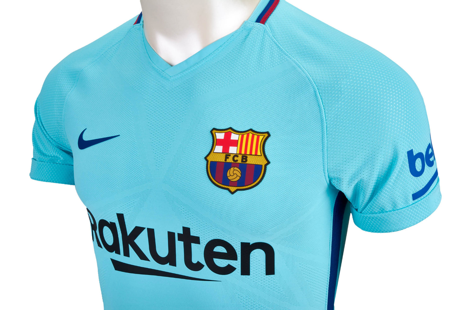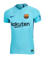 The Barcelona 2017-2018 away kit is sky blue, with darker blue highlights.