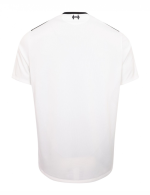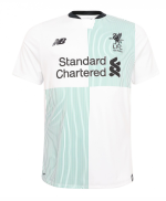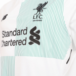 Featuring a quarter design similar to the 1996 classic it is inspired by, the Liverpool 17-18 away jersey is predominantly white with a black collar and black logos on the front. The upper left and lower right quarters of the Liverpool 2017-2018 away kit feature a pattern of green pinstripes, a modern interpretation of the original design. The sleeves are solid white.