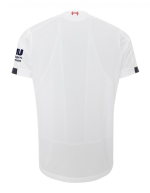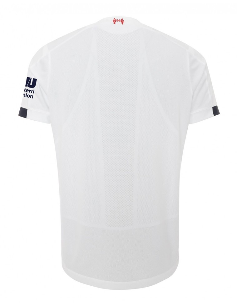 The Liverpool 2019-20 away shirt is predominantly white with grayish blue logos, based on the latest New Balance template. The sleeve cuff detail is red and blue.