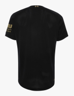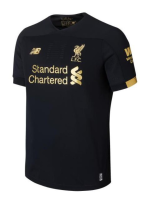 Based on a very similar template as the home shirt, the Liverpool 19-20 goalkeeper shirt is black with gold trim. All logos, including front sponsor Standard Chartered and sleeve sponsor Western Union, on the Liverpool 2019-2020 goalkeeper home jersey are gold, while the color is also used for the sleeve cuffs.