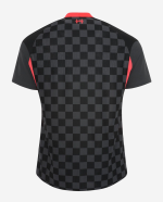 The Nike Liverpool 2020-21 third jersey combines the main color black with grey and red applications. The Nike Liverpool FC 2020-21 third football shirt has a grey / red collar and red side panels. The Nike Liverpool 2020-21 third shirt comes with a checkered pattern on the front and diagonal striping on parts of the sleeves.