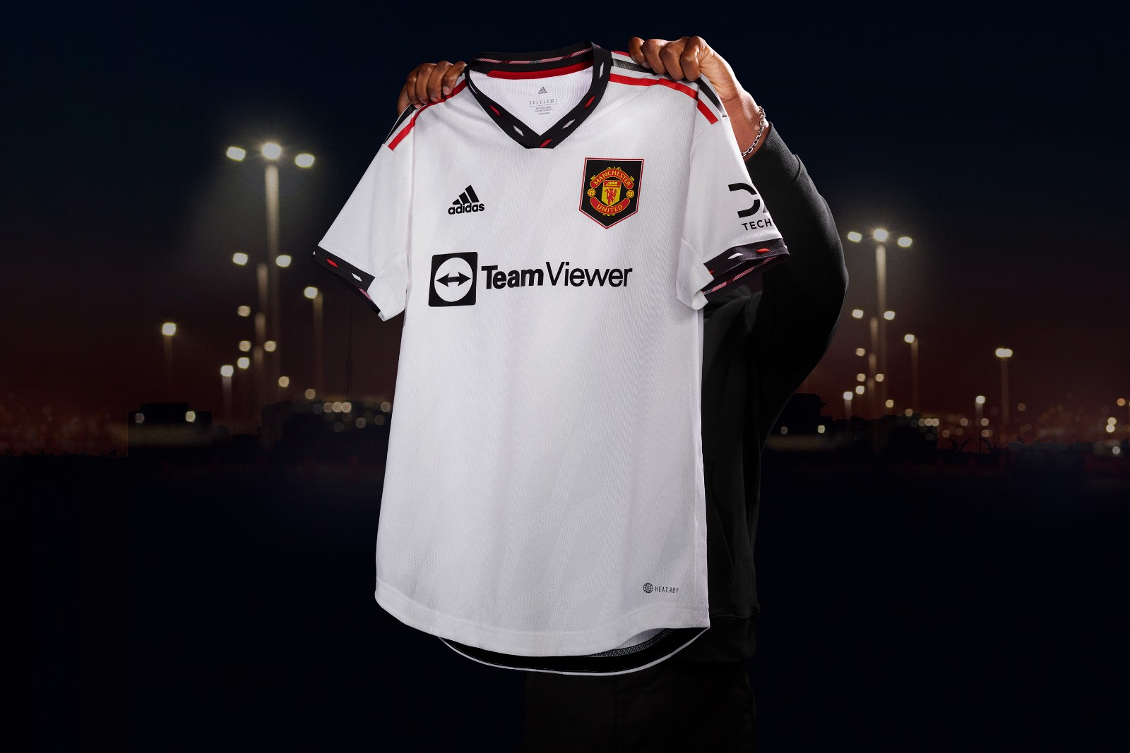 The Adidas Manchester United FC 2022-2023 away jersey combines the main color white with red and black applications. Adidas opts for a cherry red color shade for the Three Stripes, while the Adidas logo and the Teamviewer logo are black.