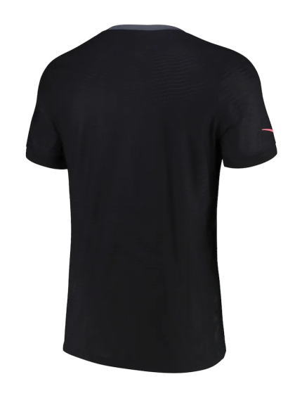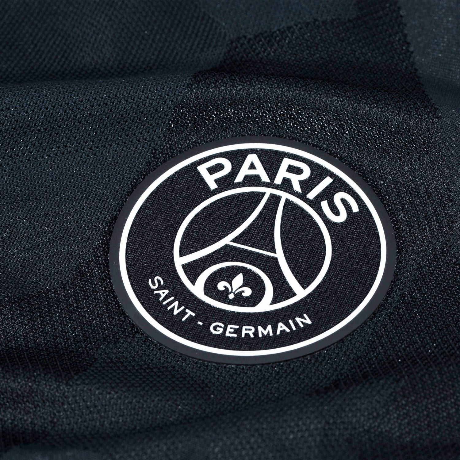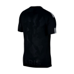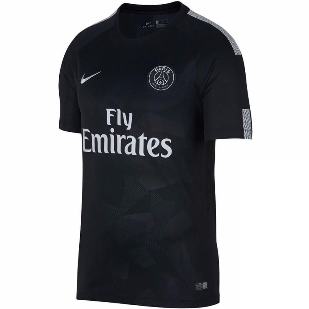 The Nike Paris Saint-Germain 2017-18 third shirt is almost entirely black. It features a bold camouflage all-over print on shirt and shorts, while metallic silver is used for the logos on the front as well as a thin stripe on each sleeve.