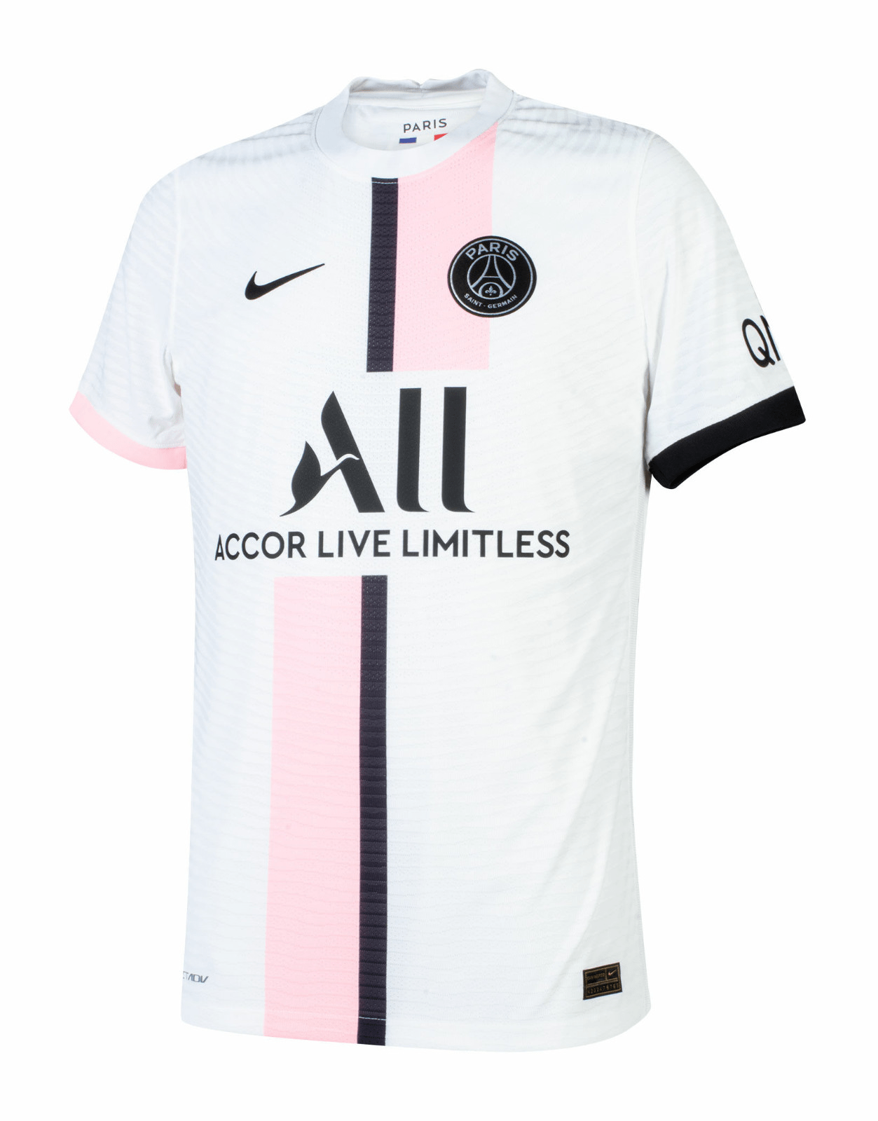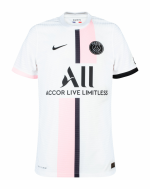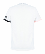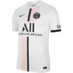 The Nike Paris Saint-Germain 2021-22 away football shirt introduces a fresh and bold look for the club. Predominantly white, the PSG 21-22 away jersey features an asymmetric stripe design in black and pink (“Arctic Punch”) on the front, inspired by the classic ‘Hechter’ stripe usually found on the home kit.
