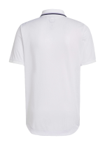 The Adidas Real Madrid 2022-23 home jersey combines the club’s iconic white color with black and purple. The Real Madrid 22-23 home kit comes with a buttoned collar. A few subtle Real Madrid crests are embossed into the fabric.