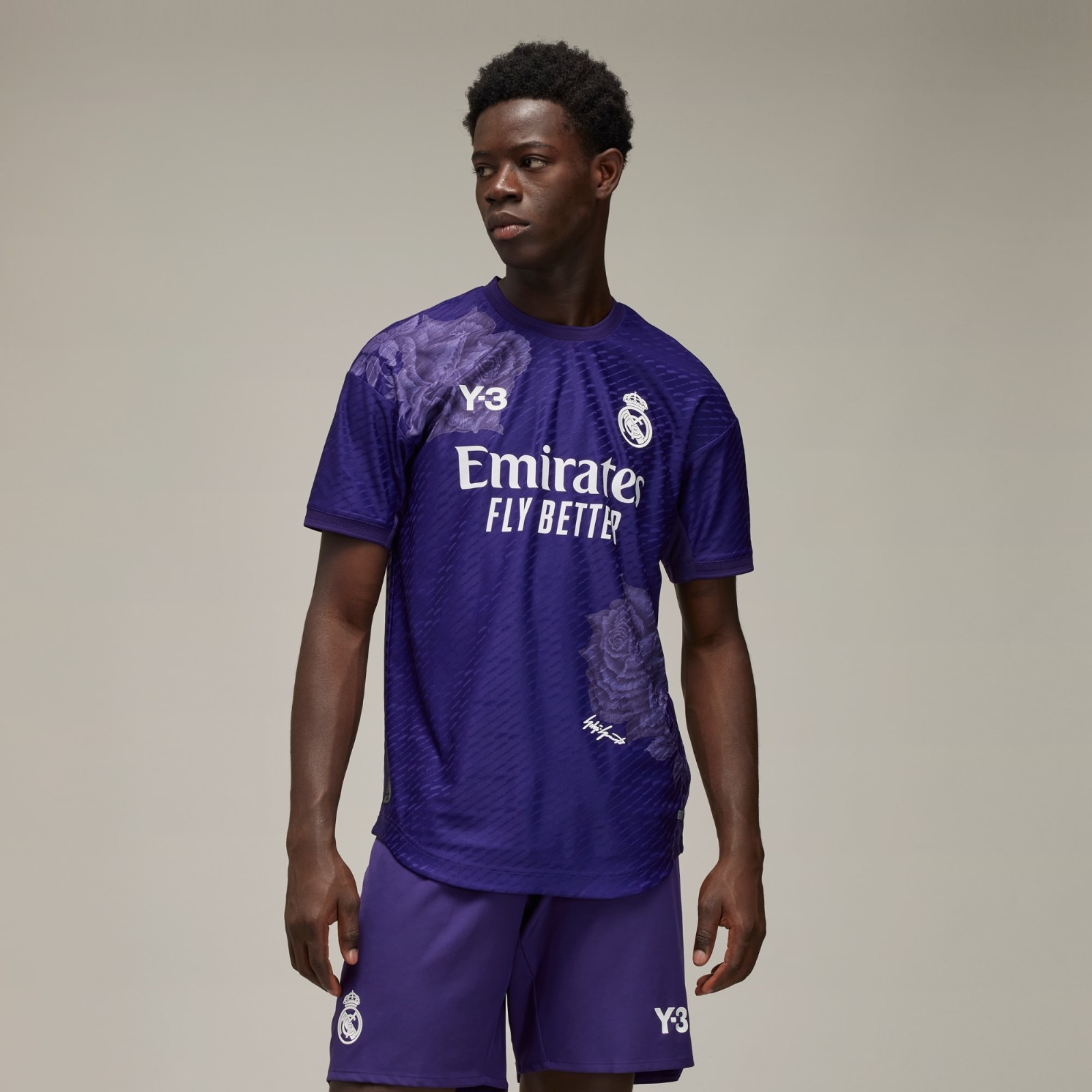 The Adidas Yamamoto 2024 Real Madrid fourth shirt has the main color purple combined with the Y-3 logo and Real Madrid crest, both in white.
