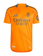 The new Adidas Real Madrid 24-25 away football shirt features colors reminiscent of the 2013-2014 third kit. It is predominantly bright orange with black applications. The collar comes with white detailing.